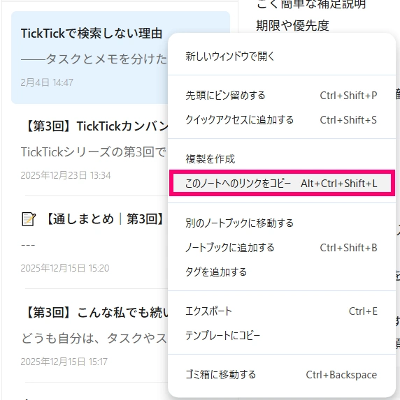 1.UpNoteで住所をコピー: 資料(例:「今回の記事の下書き」)を書いたノートを右クリック(左側の一覧の中で)して「このノートへのリンクをコピー」を押します。(クリップボードに自動でリンクがコピーされます)