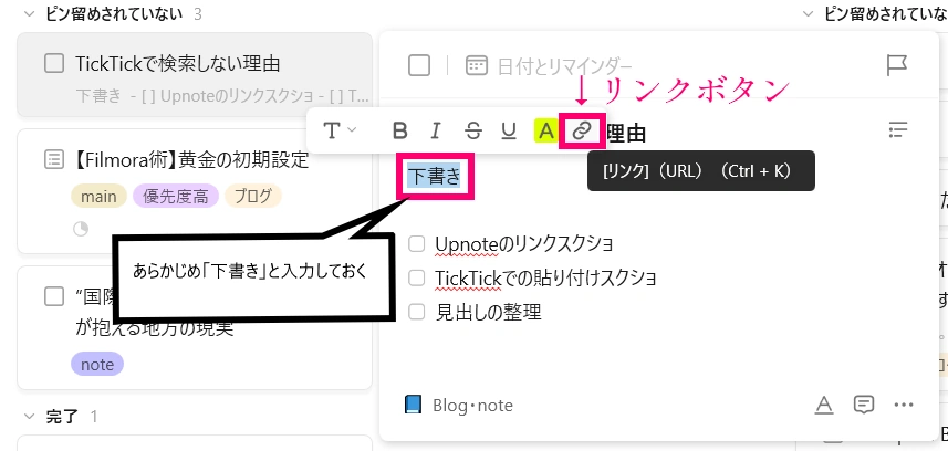 2.TickTickにボタンを作る: タスクのメモ欄に「下書き」などの文字を打ち、その文字を選択して、さっきのリンクを埋め込みます。